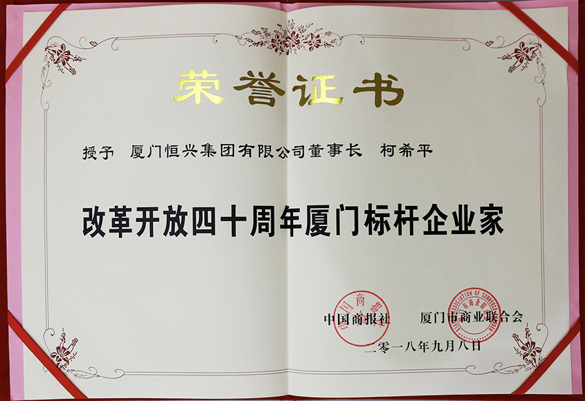 金秋迎盛會(huì),改革促發(fā)展。9月8日,在第二十屆中國國際投資貿(mào)易洽談會(huì)開幕之際,中國商報(bào)社、廈門市商業(yè)聯(lián)合會(huì)攜手主辦的“改革開放四十周年廈門標(biāo)桿企業(yè)家、創(chuàng)業(yè)精英、助力品牌、創(chuàng)新品牌”推選活動(dòng)在廈門舉行頒獎(jiǎng)儀式,61家企業(yè)家和品牌獲得殊榮。廈門恒興集團(tuán)柯希平董事長榮獲“改革開放四十周年廈門標(biāo)桿企業(yè)家”榮譽(yù)稱號。